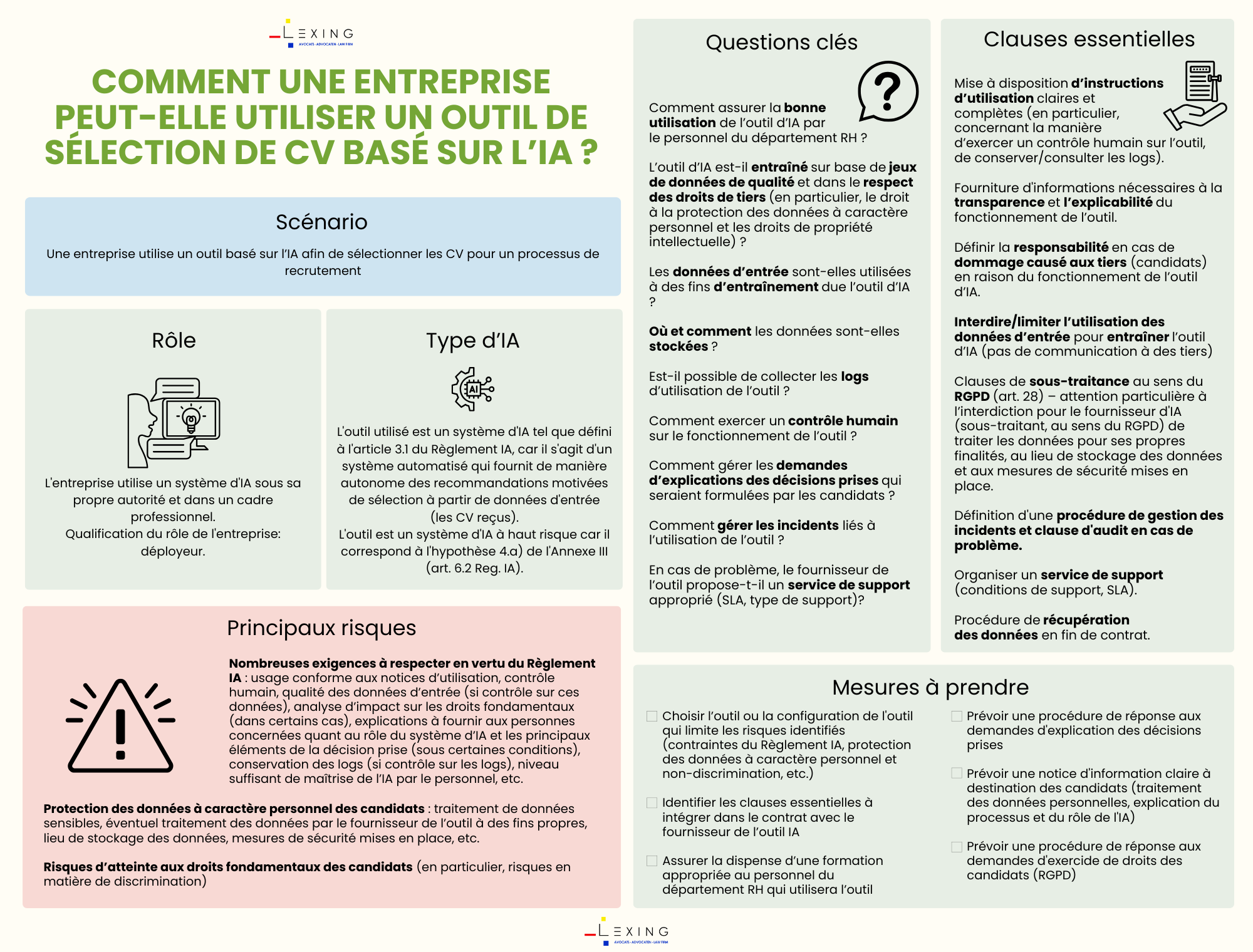Grâce à son expertise reconnue en droit de l’innovation et des technologies, Lexing a mis au point des outils visant à accompagner les entreprises dans leurs projets d’intelligence artificielle :